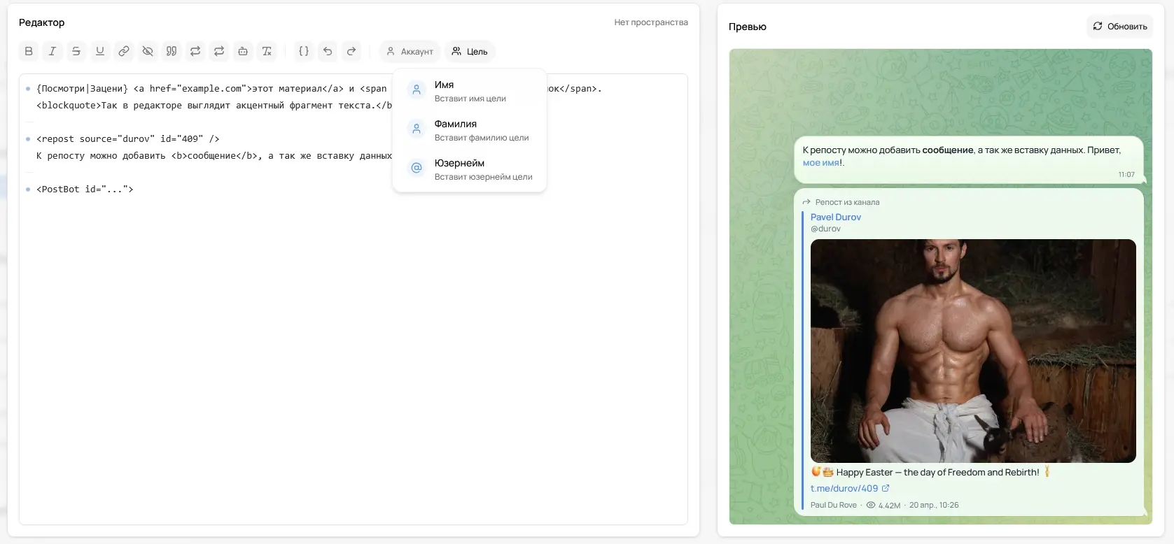 Умный редактор - настраивайте сообщение на отправку и смотрите результат сразу в предпросмотре