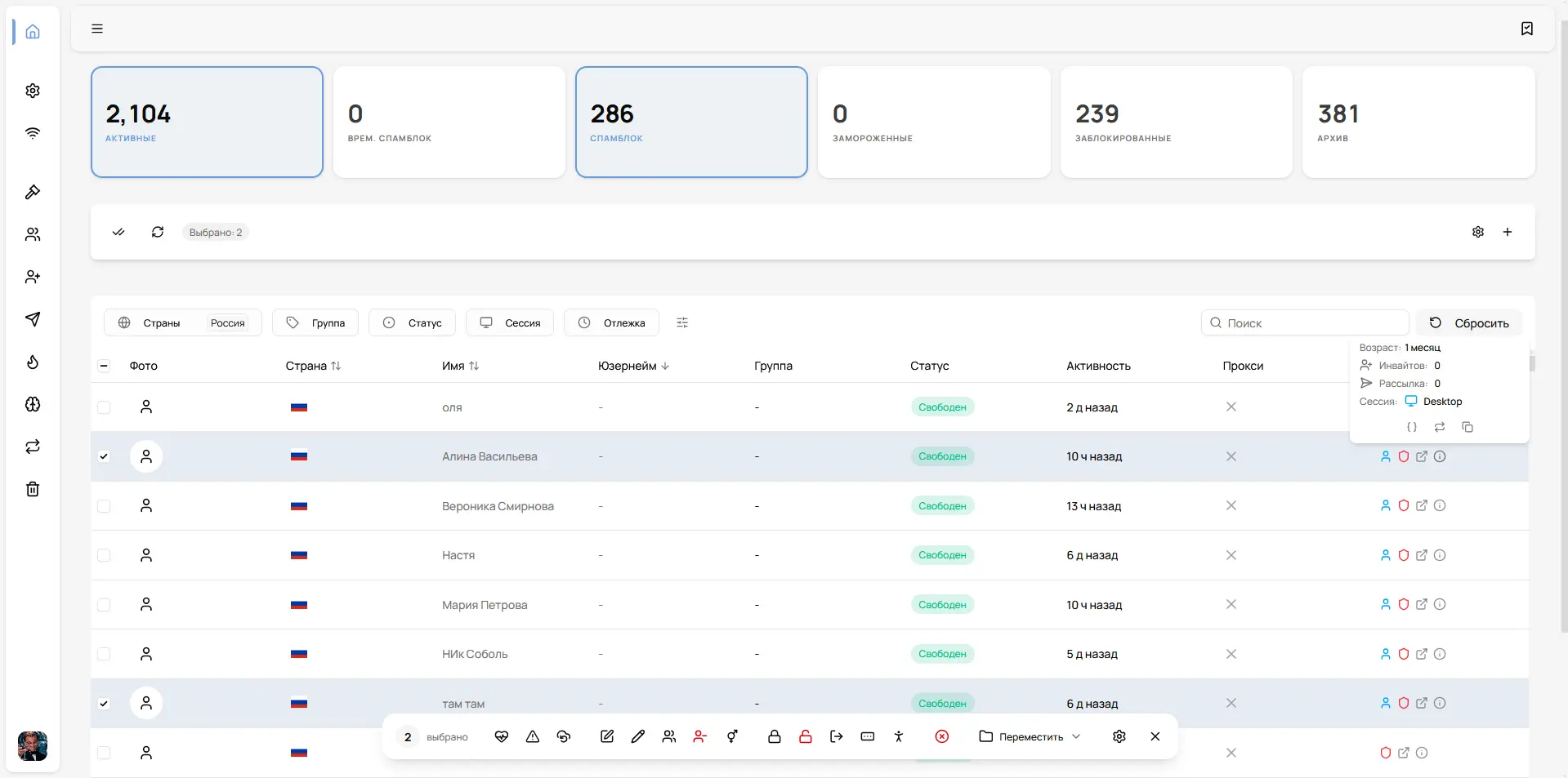 Панель аккаунтов - полноценное и гибкое управление аккаунтами. Удобные фильтры на любой вкус, быстрый поиск, теги и продуманная система группировки — всё, чтобы держать порядок даже в большом количестве аккаунтов. Редактирование максимально комфортное: можно менять настройки как у одного аккаунта, так и сразу у целого пула