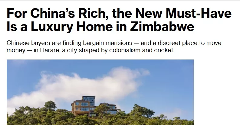 彭博报道说,在津巴布韦首都哈拉雷富裕郊区海兰兹的主干道上,一块广告牌上展示着一个面带笑容的中国年轻家庭,他们站在一栋新建住宅前 。