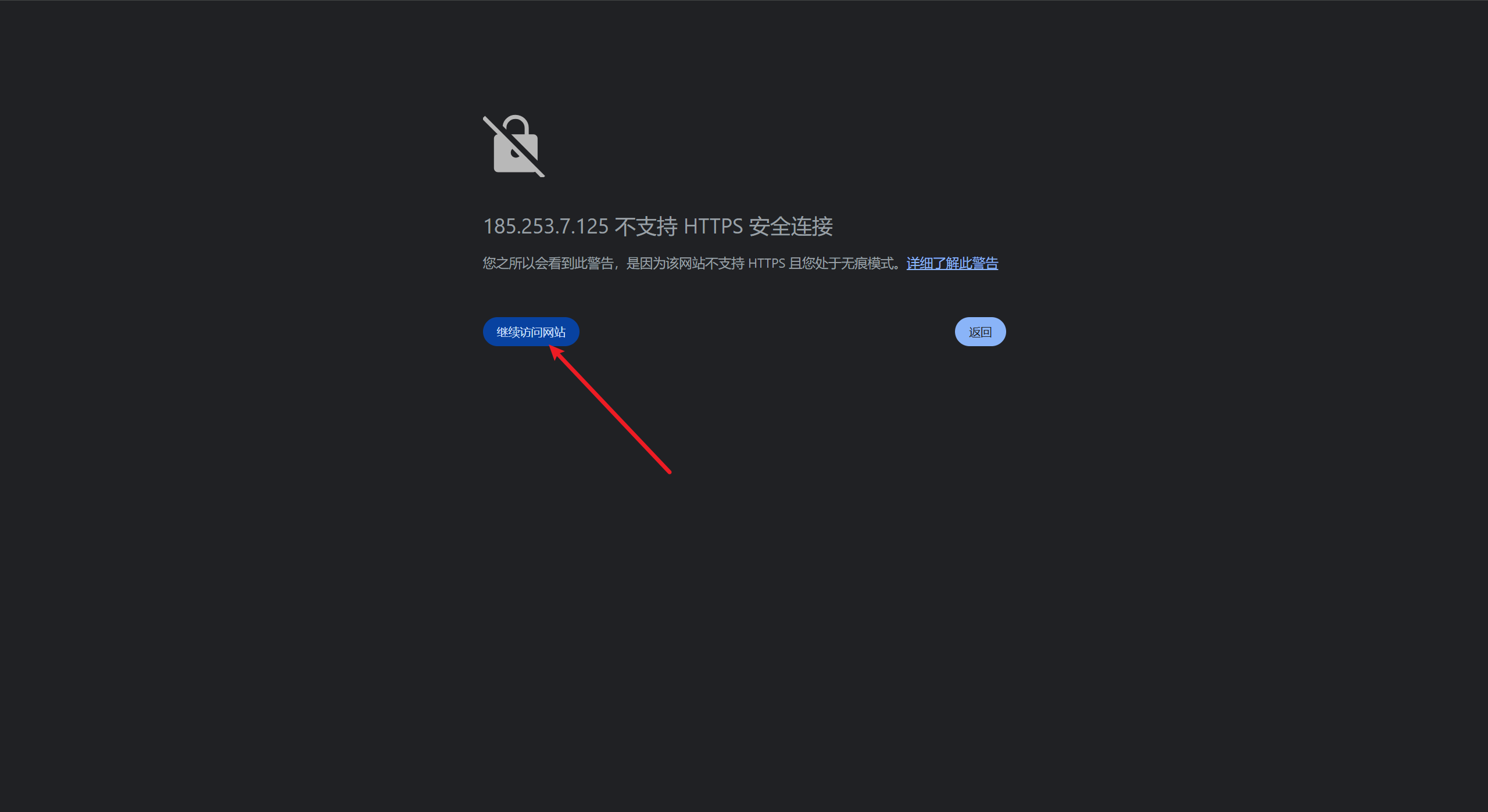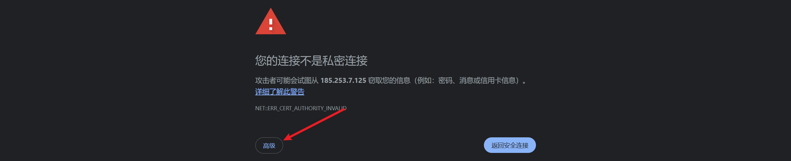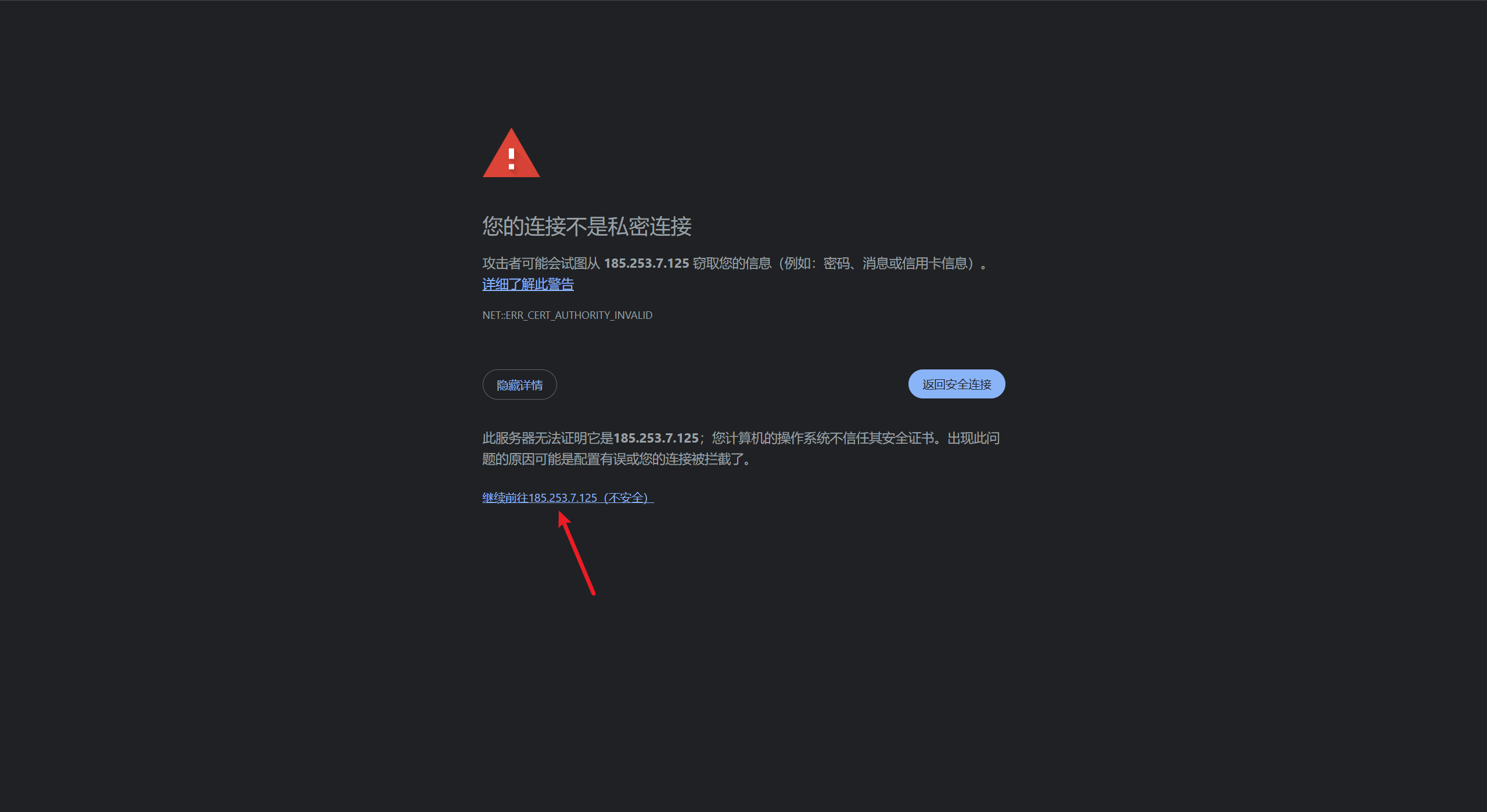 然后复制服务器IP到浏览器打开,选择高级,继续前往