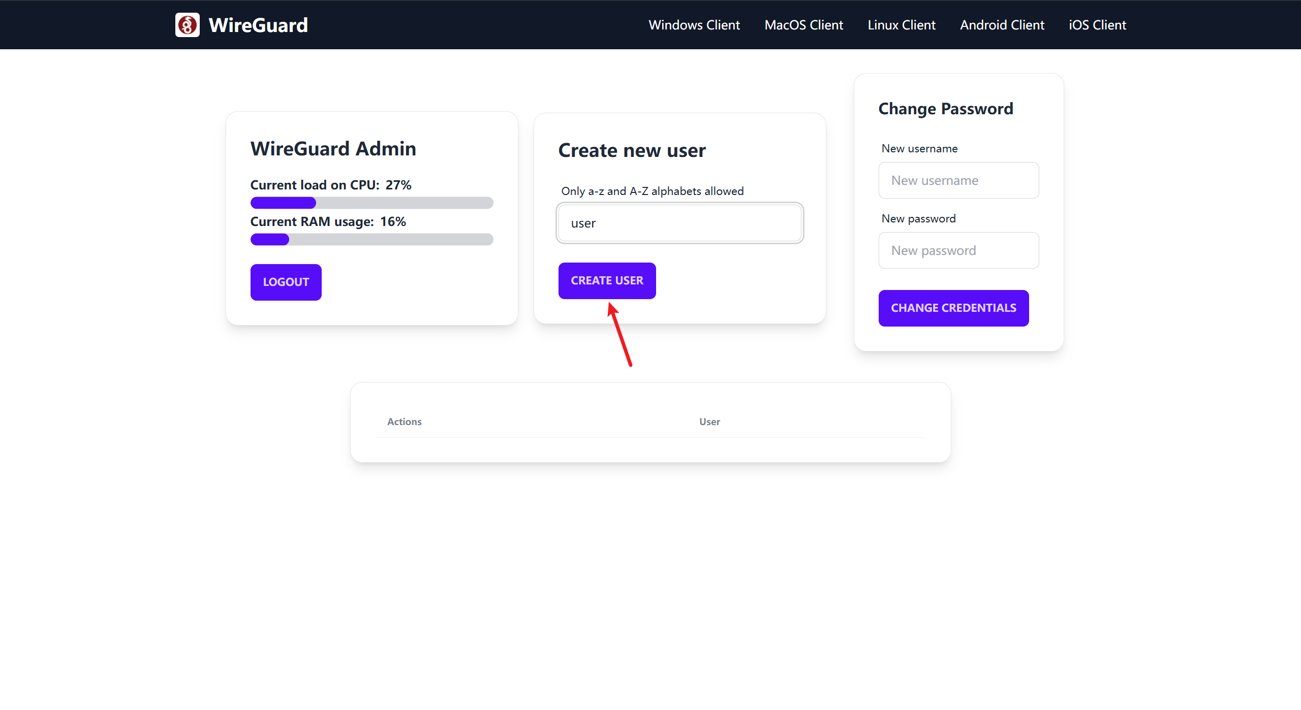 指定 WireGuard 用户的名称,例如“用户”,然后单击**“创建用户”** 按钮。