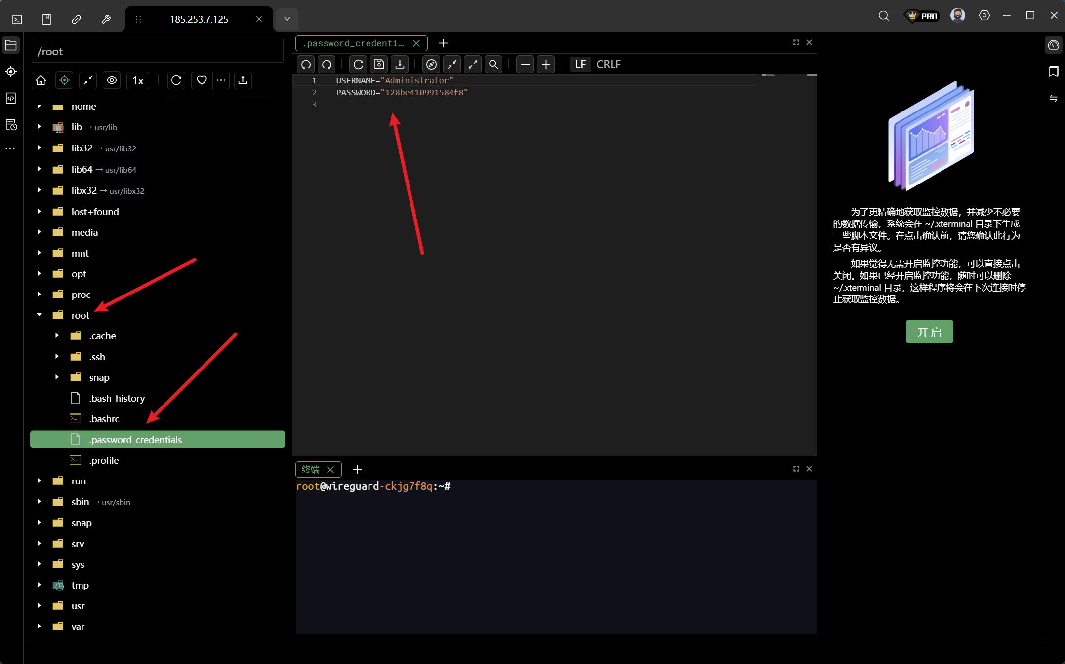 通过SSH工具连接到服务器,系统将创建一个名为“Administrator”的管理员用户,并设置网页访问密码,密码存储在文件 /root/.password_credentials 中。