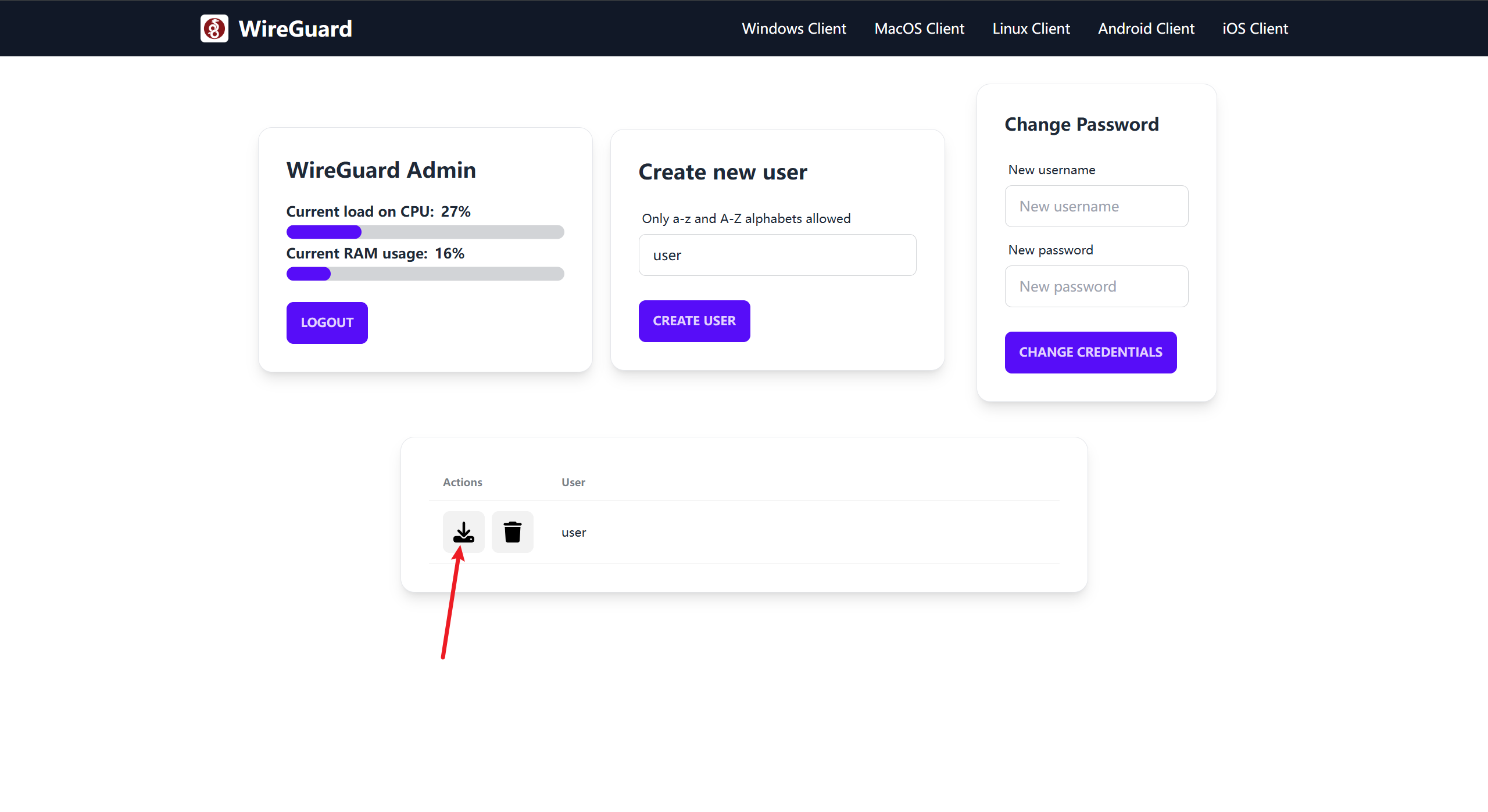 然后下载 WireGuard 的配置文件。点击下方下载按钮(向下箭头)即可下载。请参见屏幕截图: